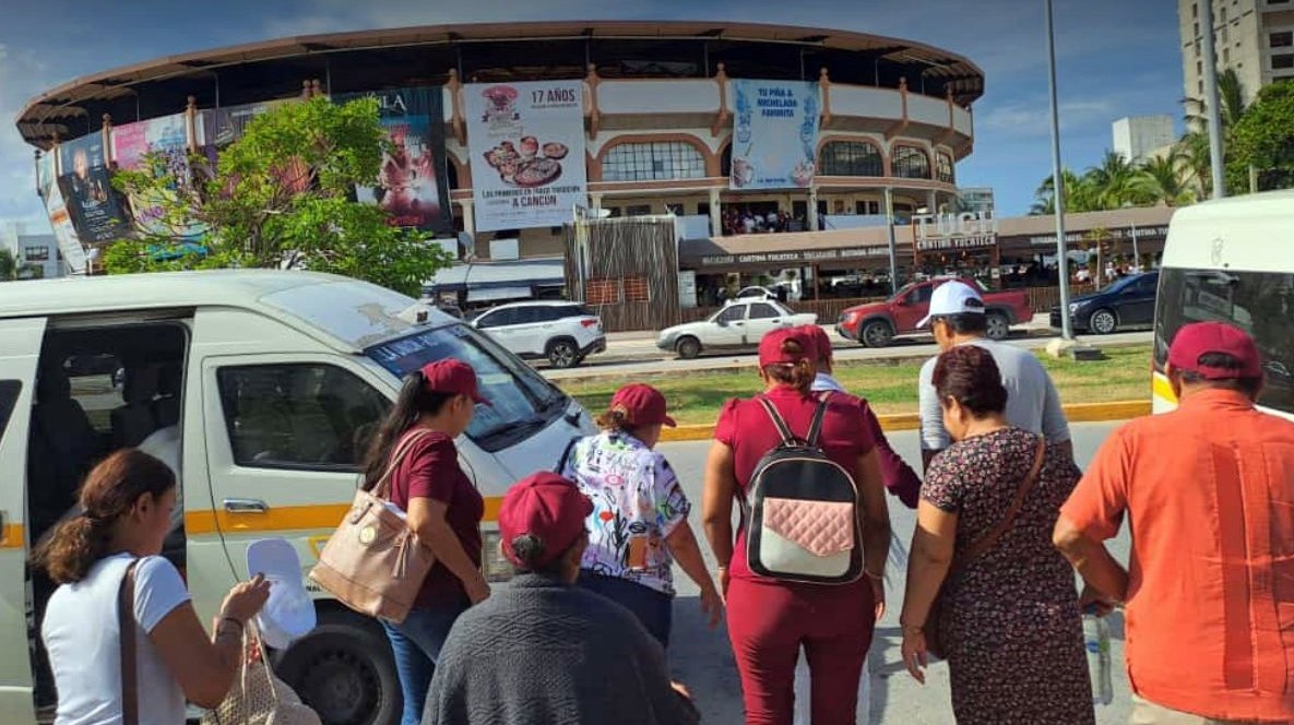 Lo que significa un brutal dispendio de recursos y prácticas políticas que traicionan los principios de Morena, la gente fue convocada en el estacionamiento de la Plaza las Américas en Chetumal, con destino a la Plaza de Toros de la ciudad de Cancún, gente que vestía principalmente ropa guinda, destacando gorras y playeras de ese color.